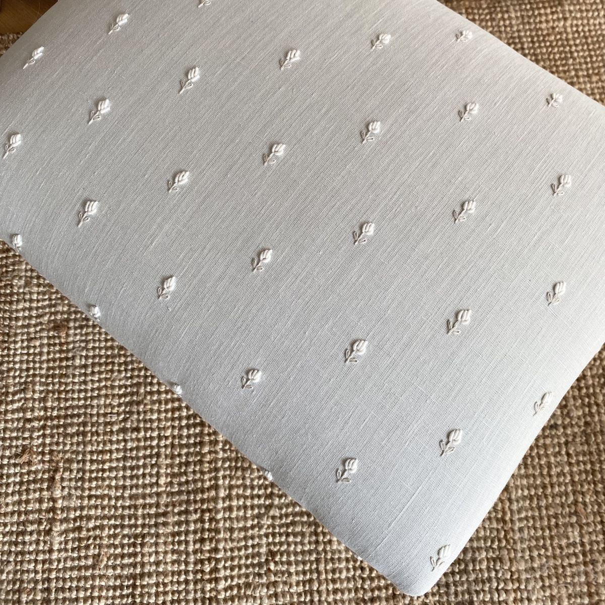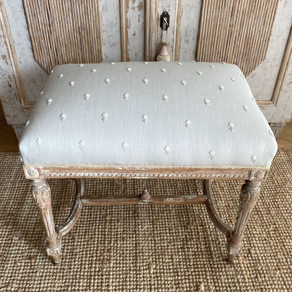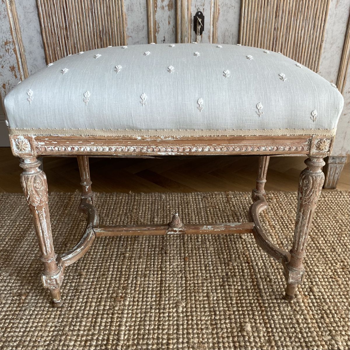 A large 19th century French stool with traces of original gilding reupholstered and covered in a hand embroidered linen (white and ecru flowers on a pale blue/grey background) strong and stable to use