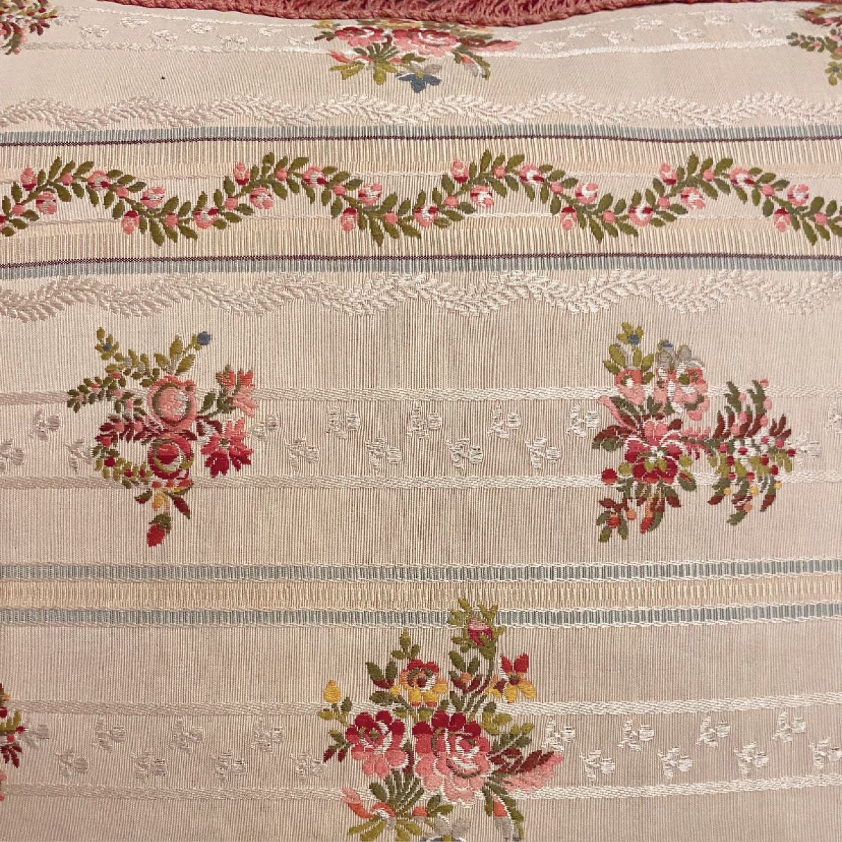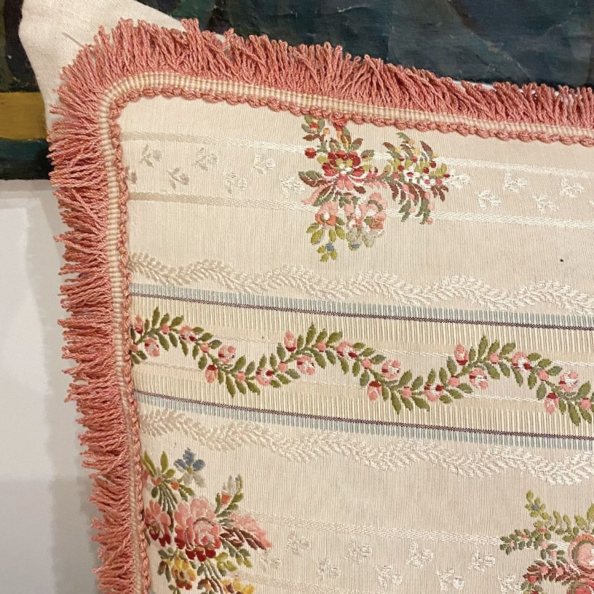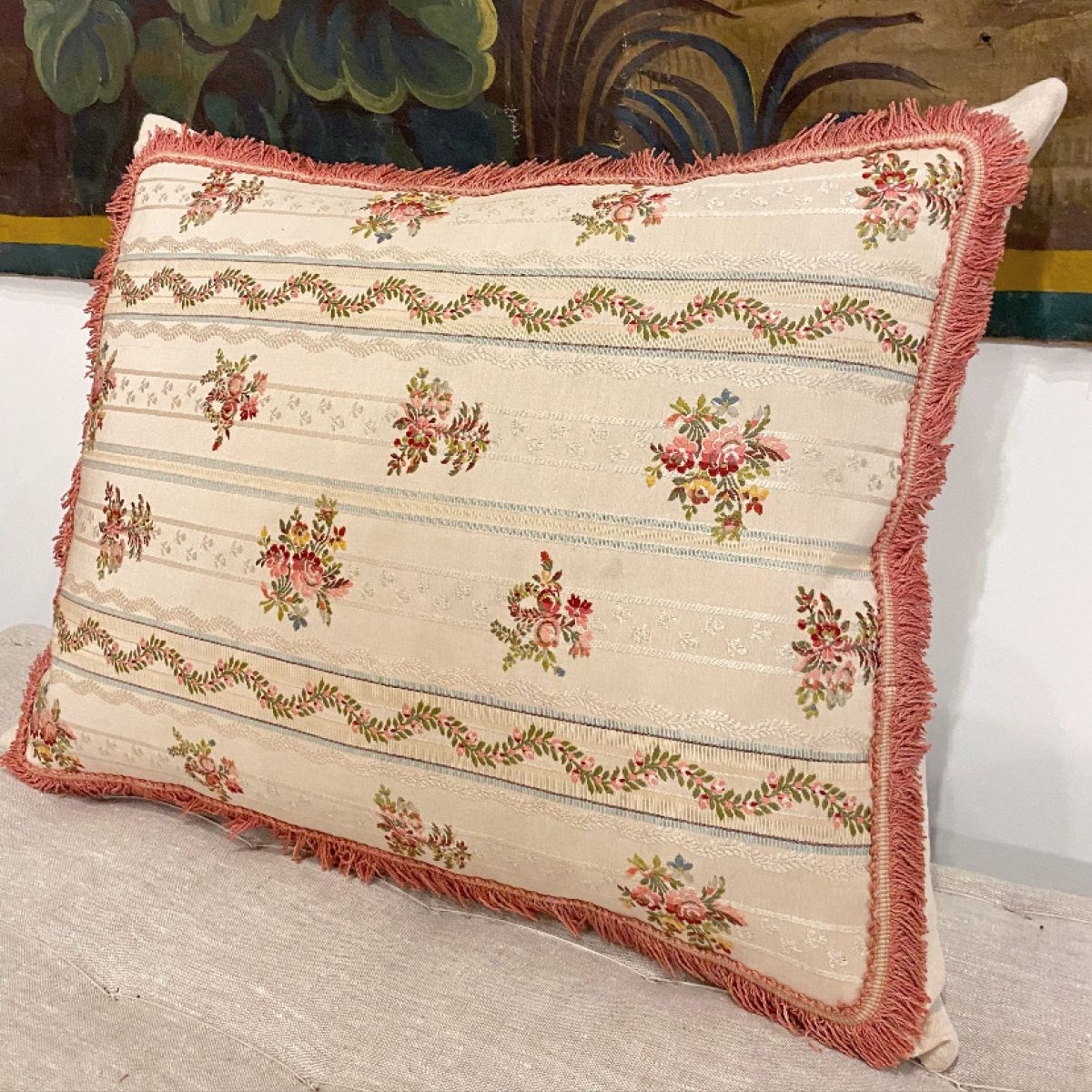 A large French silk and cotton brocade cushion with pretty multicoloured floral sprigs on a cream background edged with a vintage pink cotton fringe on antique linen - zipped at bottom - plump feather pad