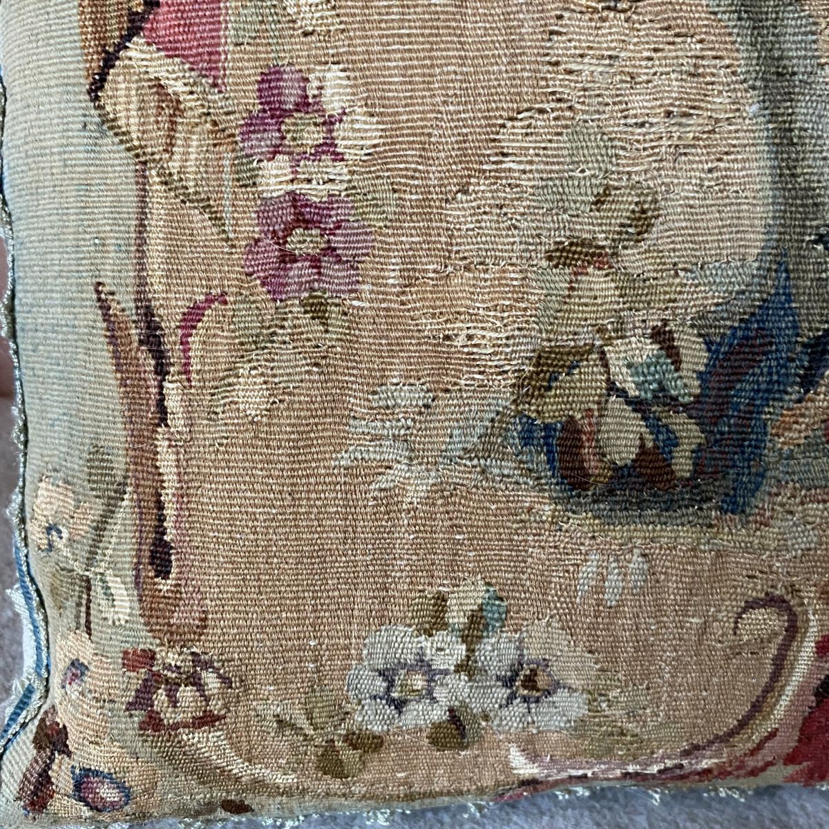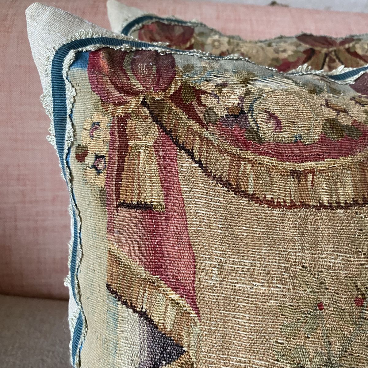 Beautiful large early 19th century French Aubusson panel - finely stitched birds and florals within a ribboned frame - age related wear (not restored) placed on antique hemp linen in a honey colour with the same linen to reverse - trimmed with a Claremont braid - hand stitched closed at bottom - plump luxurious down feather pad