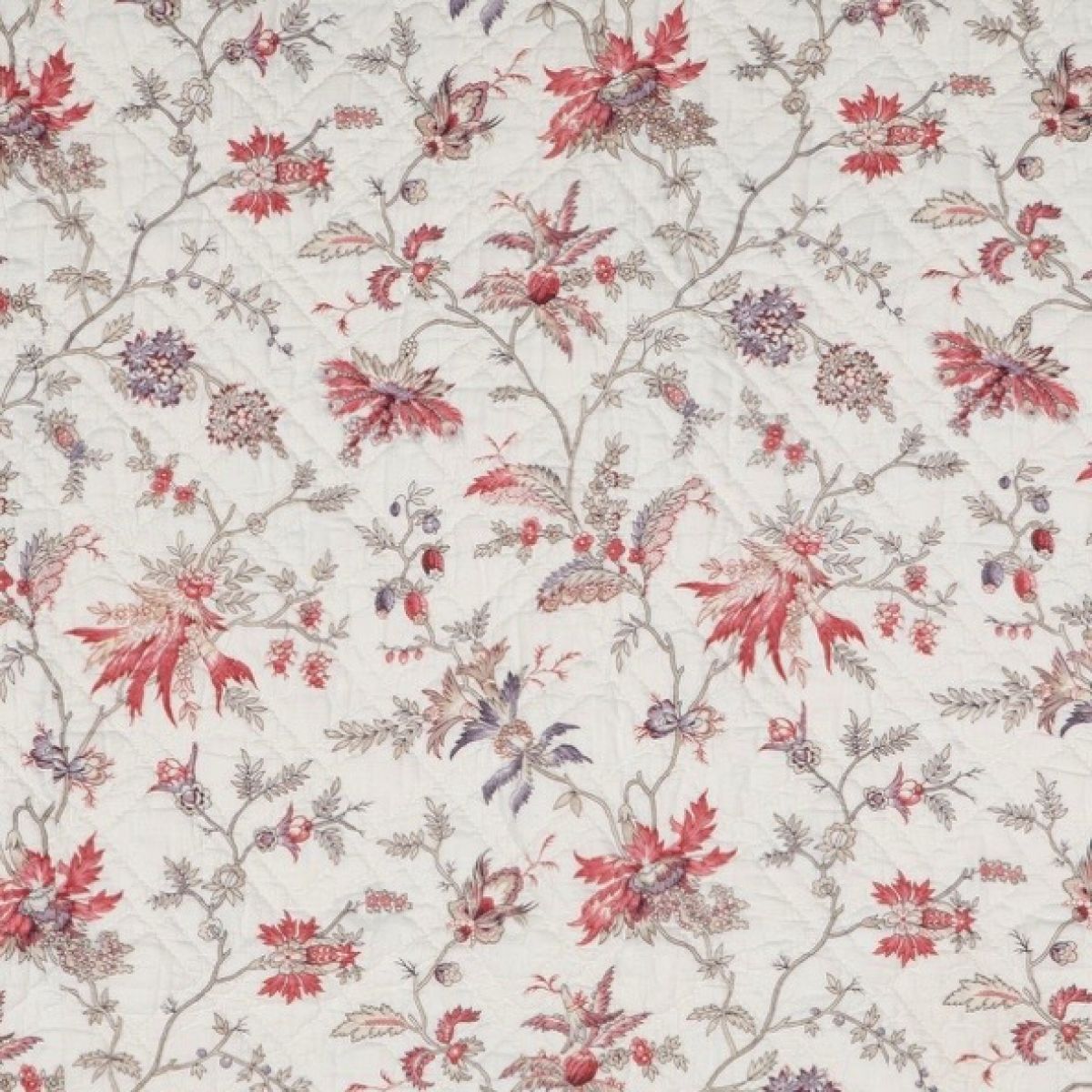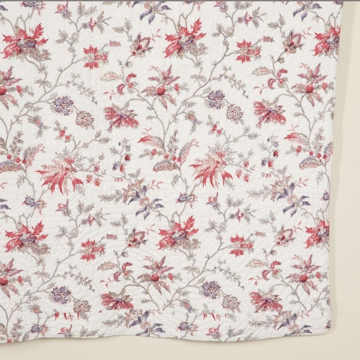 A mid 19th century French Provençal hand stitched quilt with pretty mixed colour trailing florals on a white background in good condition - the reverse is a small print with one patched area and small marks