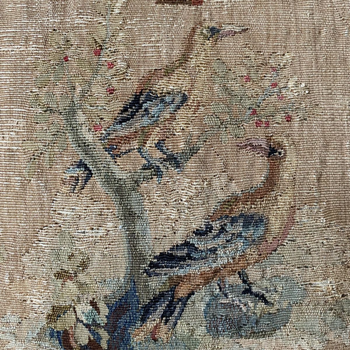 Beautiful large early 19th century French Aubusson panel - finely stitched birds and florals within a ribboned frame - age related wear (not restored) placed on antique hemp linen in a honey colour with the same linen to reverse - trimmed with a Claremont braid - hand stitched closed at bottom - plump luxurious down feather pad