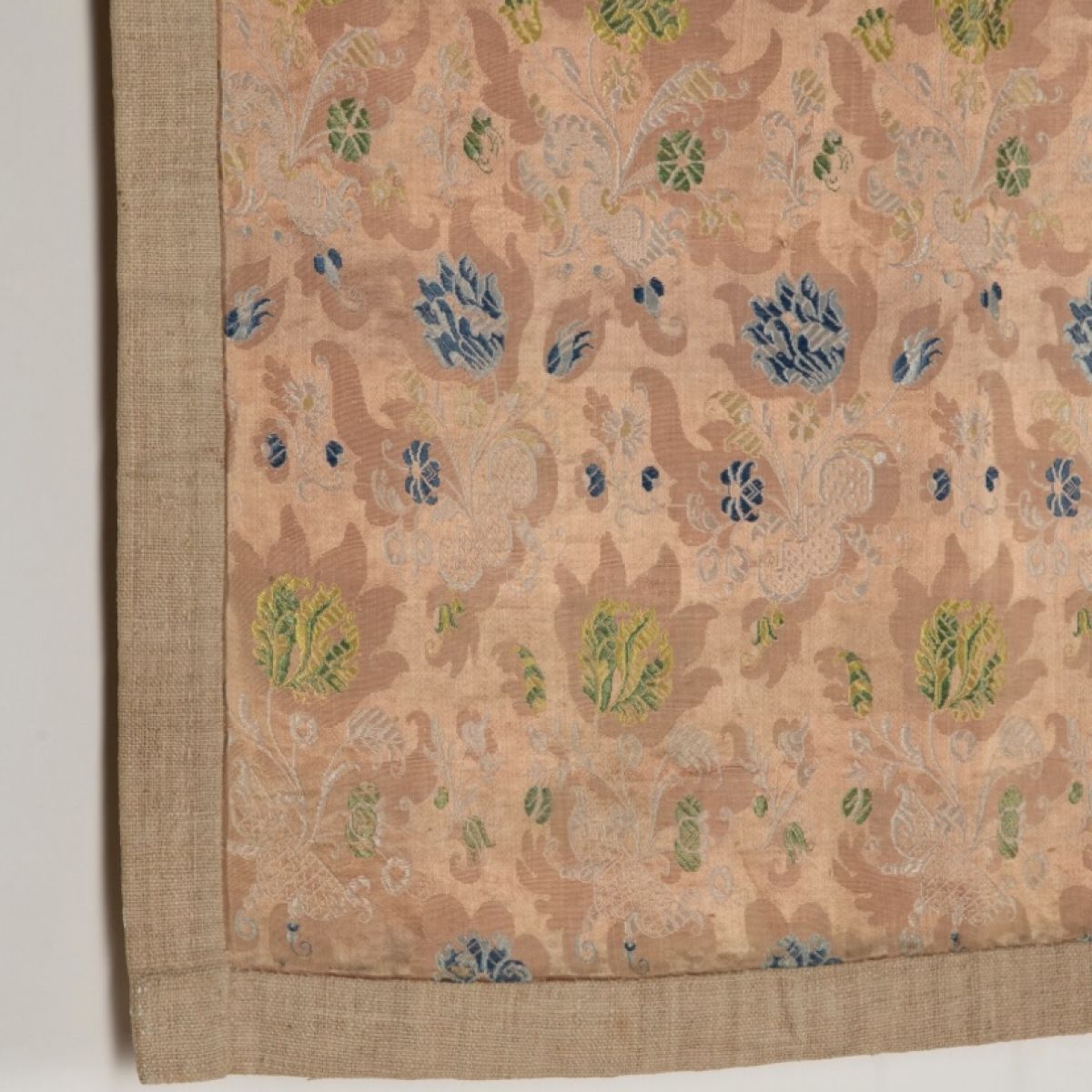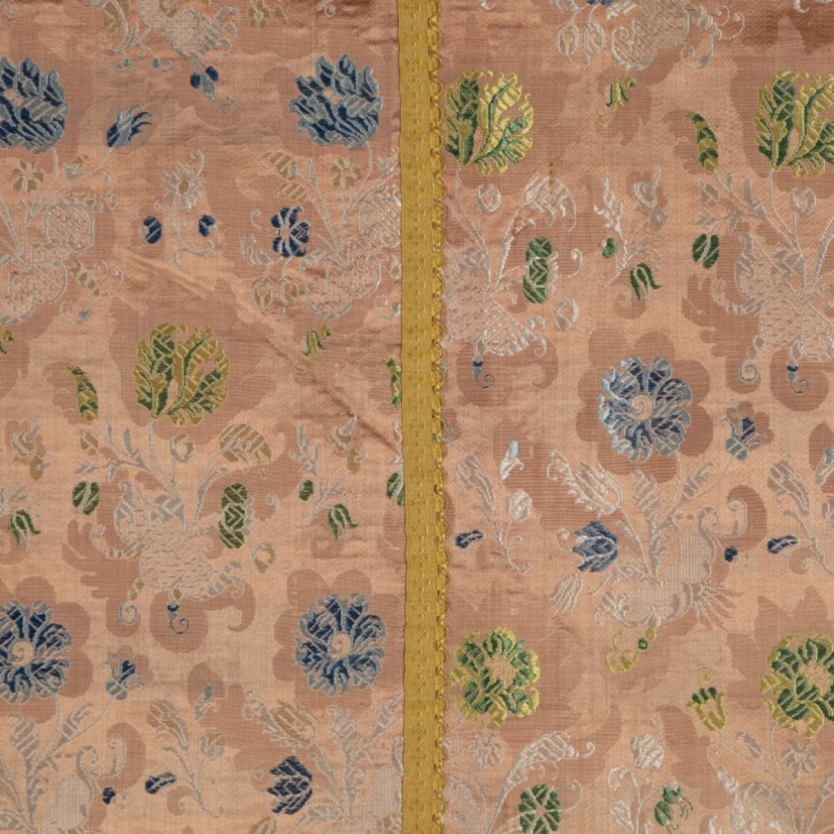Exceptional 18th century Italian silk panel - originally this would likely have been a dress silk and at some point has been converted into an alter cloth which displays beautifully as a wall hanging - it is edged and backed with 18th century hemp linen and the individual silk panels are edged with antique gold braid - all textiles are in excellent condition and the silk shows no sign of wear