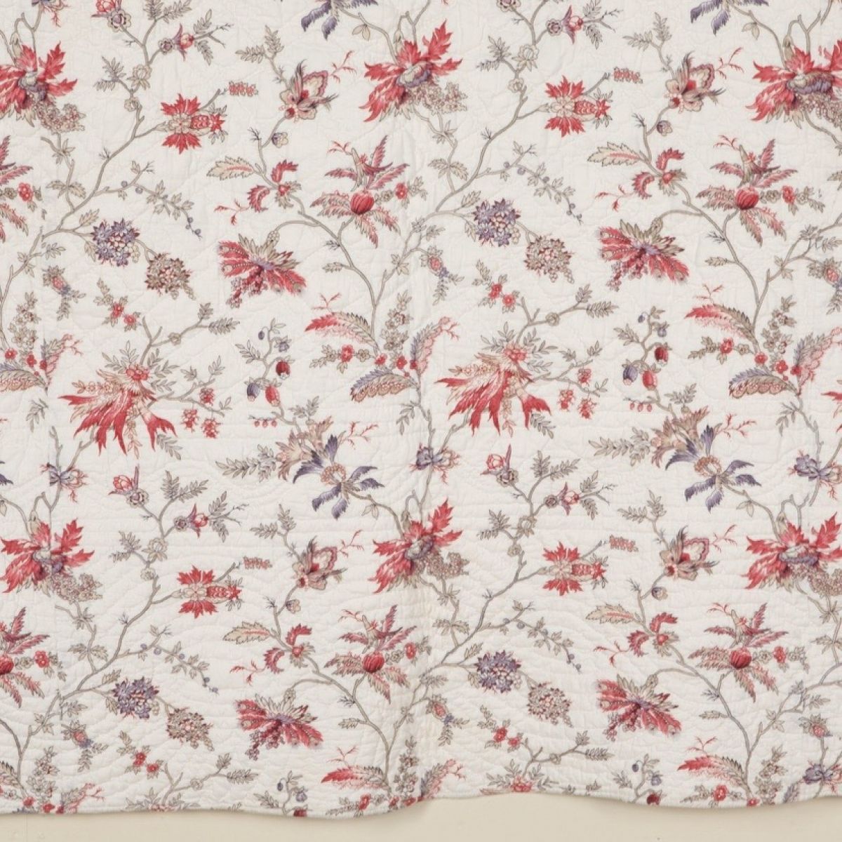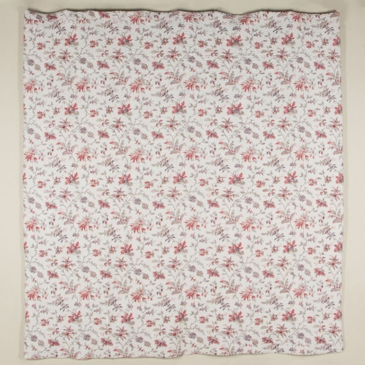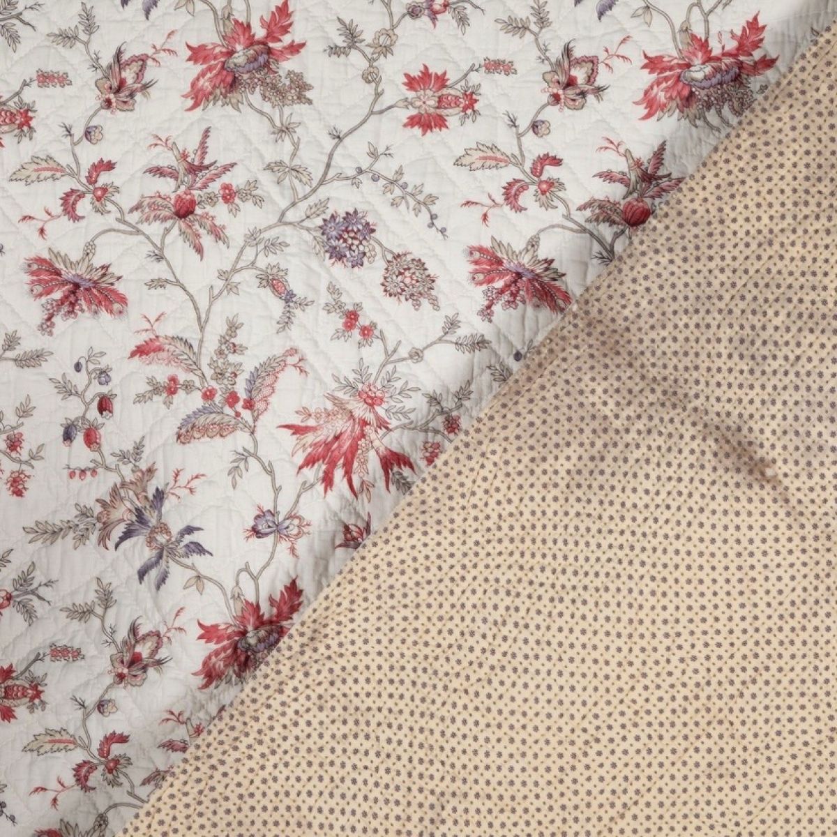A mid 19th century French Provençal hand stitched quilt with pretty mixed colour trailing florals on a white background in good condition - the reverse is a small print with one patched area and small marks